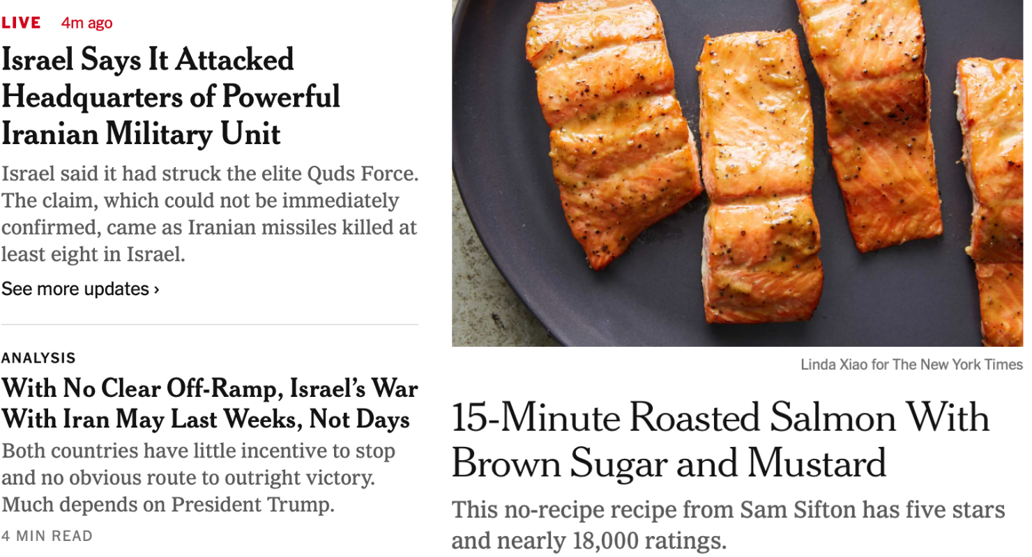NEW YORK CITY – Venerable American daily broadsheet The New York Times announced today that all its lead news stories will be coupled with popular food recipes at the top of the front page after it alarmingly caved to a newly fussy subscriber base that has not only completely turned against the Times’ usual pro-Israel coverage but also now demands a more popular, “based” TikTok-infused worldview as imagined by an average ketamine-addicted middle-schooler in Parsippany, New Jersey.